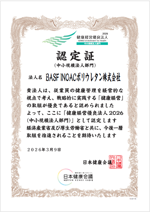 今年度も、弊社 BASF INOACポリウレタン株式会社(BIP)は、経済産業省と日本健康会議が共同で選定する「健康経営優良法人2026」に認定されました。