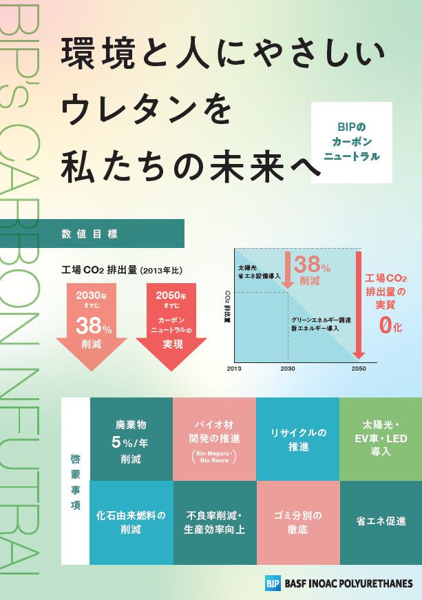 BASF INOAC ポリウレタン株式会社は、持続可能な社会の実現に向け、2013年度比でScope1およびScope2のCO₂排出量を2030年までに38%削減することを目標に、環境施策を推進しています。